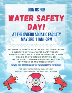 The City of Oviedo will be hosting Water Safety Day at the Oviedo Aquatic Facility on Saturday, May 3rd, 11am-3pm. We will be kicking off