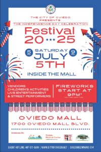 Independence Celebration! Enjoy all kinds of food, drinks, vendors, activities, entertainment, characters/performers, etc inside the Oviedo Mall starting at 5pm then kick back and watch
