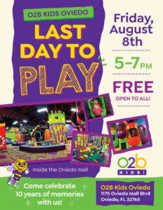 You’re invited to one Last Day to Play at O2B Kids Oviedo! Join us as we say goodbye to a place full of 10 years