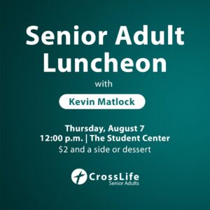 We are excited to once again kick off our luncheons for the fall! Kevin Matlock, our Senior Adults and Care Pastor, will be sharing with