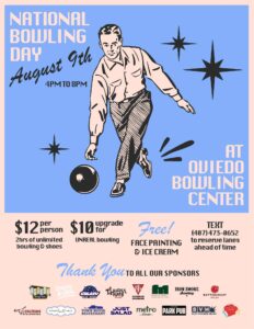 It’s our second annual NATIONAL BOWLING DAY CELEBRATION!!!! The entire center will have glow colored pin bowling which means YOU will win AMAZING prizes &