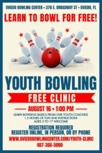 -Free bowling clinic for kids 5 to 17 years old-Check in at 1pm. Bowling from 1:30pm to 3pm.-Our youth bowling coaches will provide basic bowling