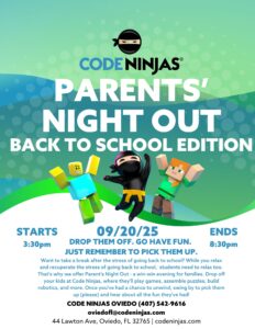 We are excited for Code Ninjas Oviedo’s first Parents’ Night Out!!! Have your ninjas come join us on Saturday, September 20th from 3:30 to 8:30
